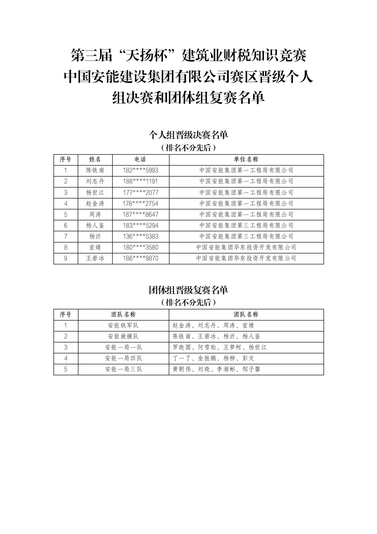 中国安能建设集团有限公司赛区晋级个人组决赛和团体组复赛名单