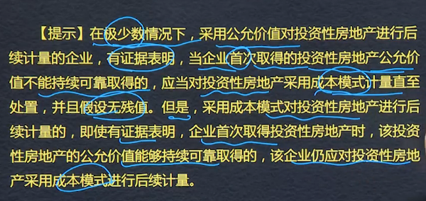 2、成本模式下,减值一经计提不得转回。(同固定资产、无形资产)