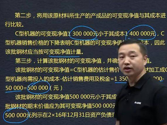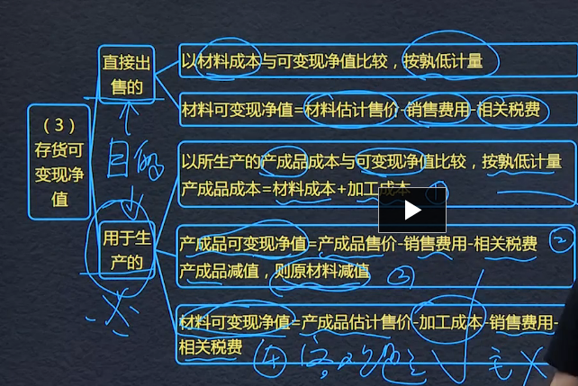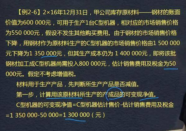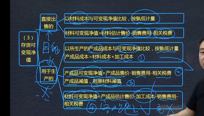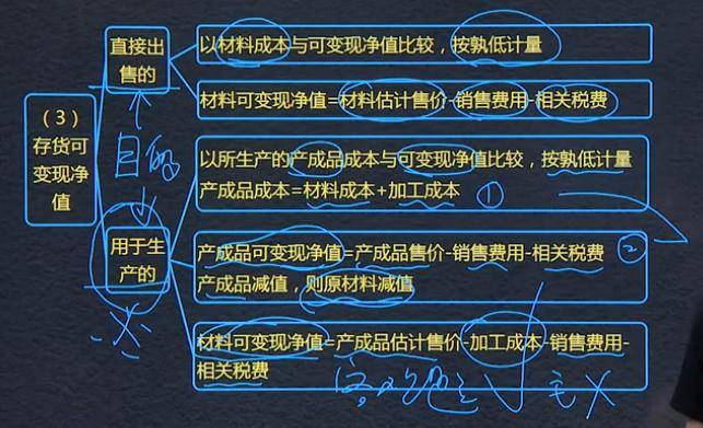 1、存货可变现净值:a、直接出售的,材料可变现净值=材料估计售价-销售费用-相关税费;b、用于生产的,产成品可变现净值=产成品售价-销售费用-相关税费。产成品减值,则原材料减值。