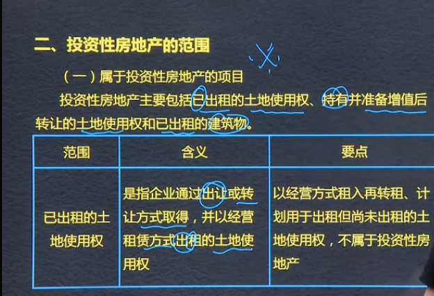 投资性房地产:已出租的土地使用权,已出租的建筑物,持有并准备增值后转让的土地使用权。