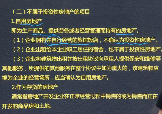 二、不属于投资房地产的项目,包括:自用房地产,用为存货的房地产。