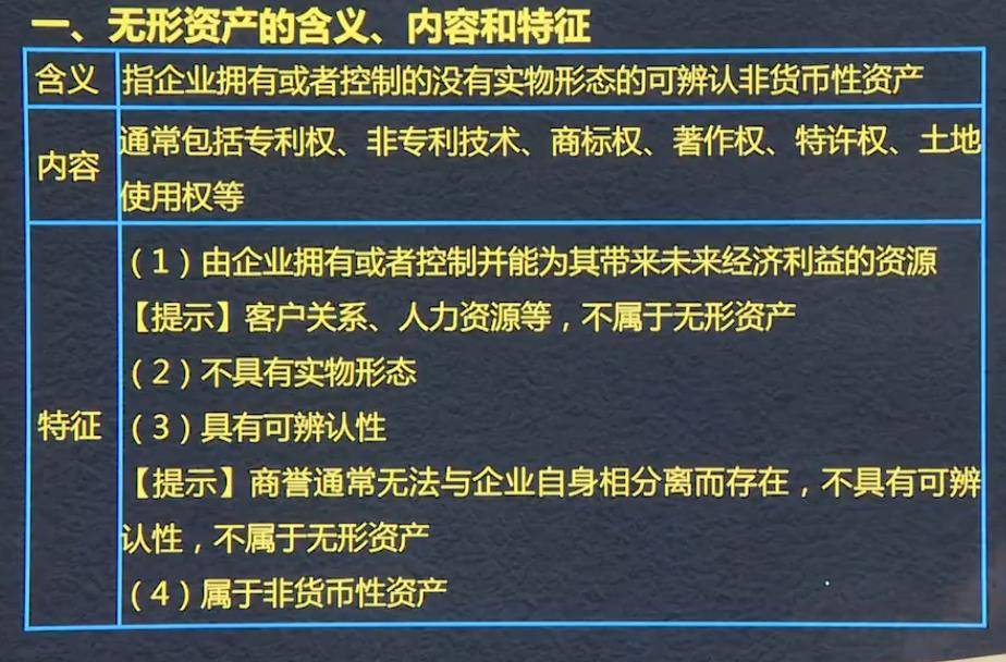 含义:指企业拥有或者控制的没有实物形态的可辨认非货币资产。