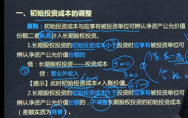 a、初始投资成本小于取得时应享应计入取得投资有被投资单位可辨认净资产公允价值份额,两者之间的差额体现为双方交易作价过程中转让方的让步,该部分经济利益流入应计入取得投资当期的营业外收入,增加初始投资成本的账面价值。