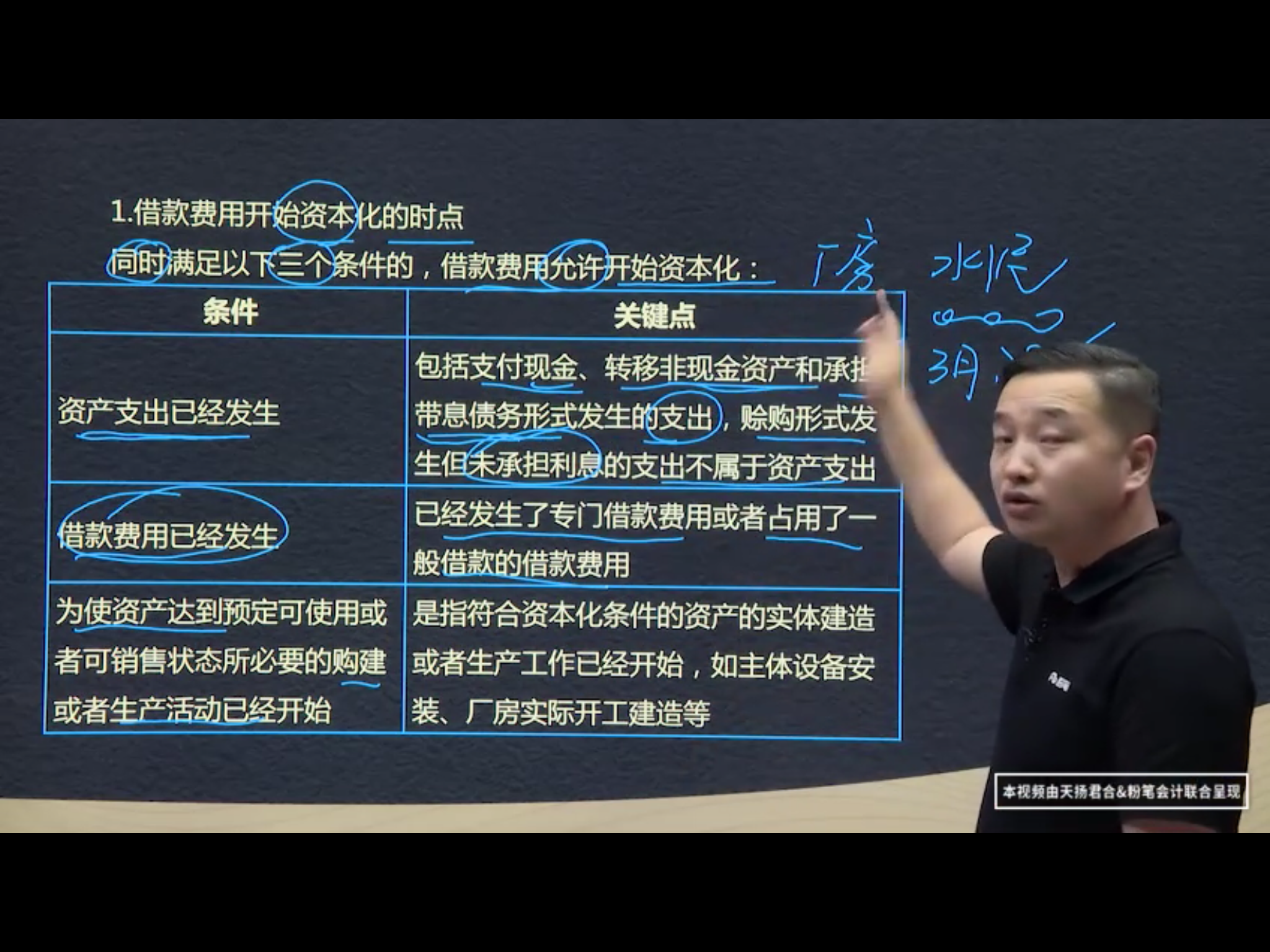 1.直接符合资本化条件的资产构建或生产的-予以资本化,计入资产成本(不包括借款费用暂停资本化期间)
