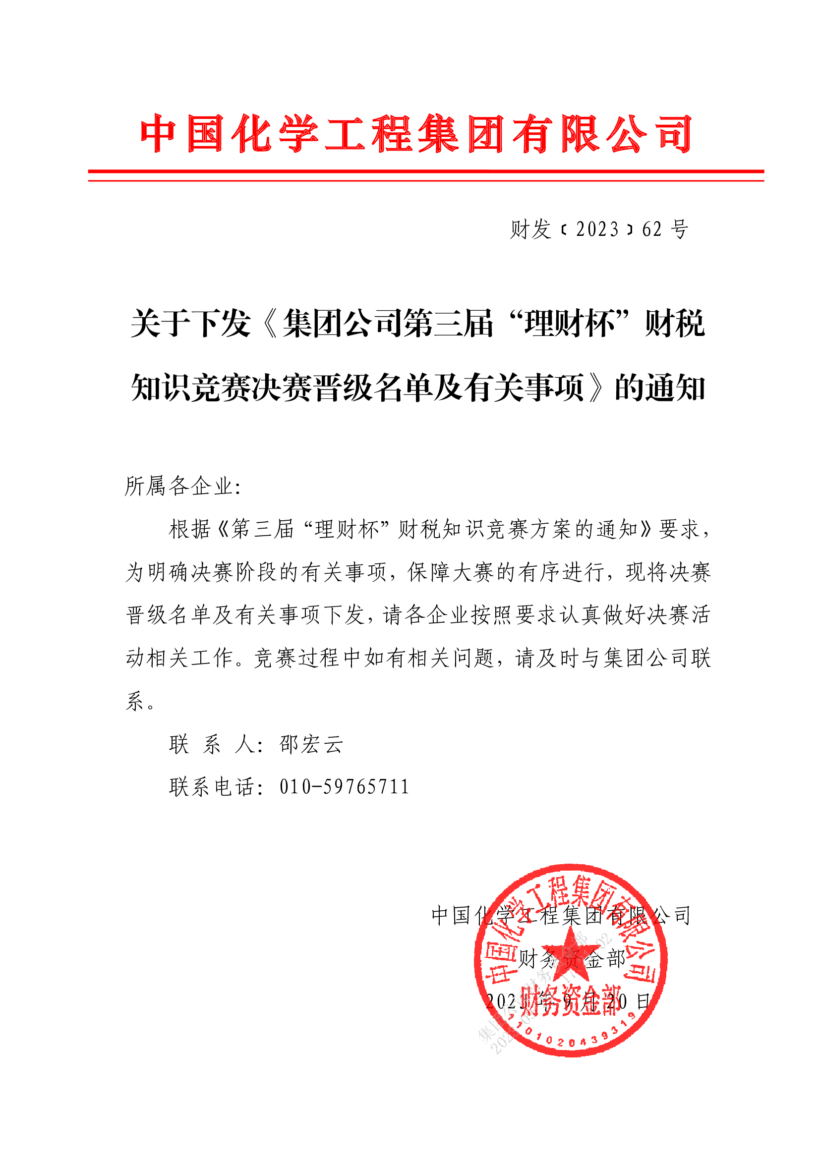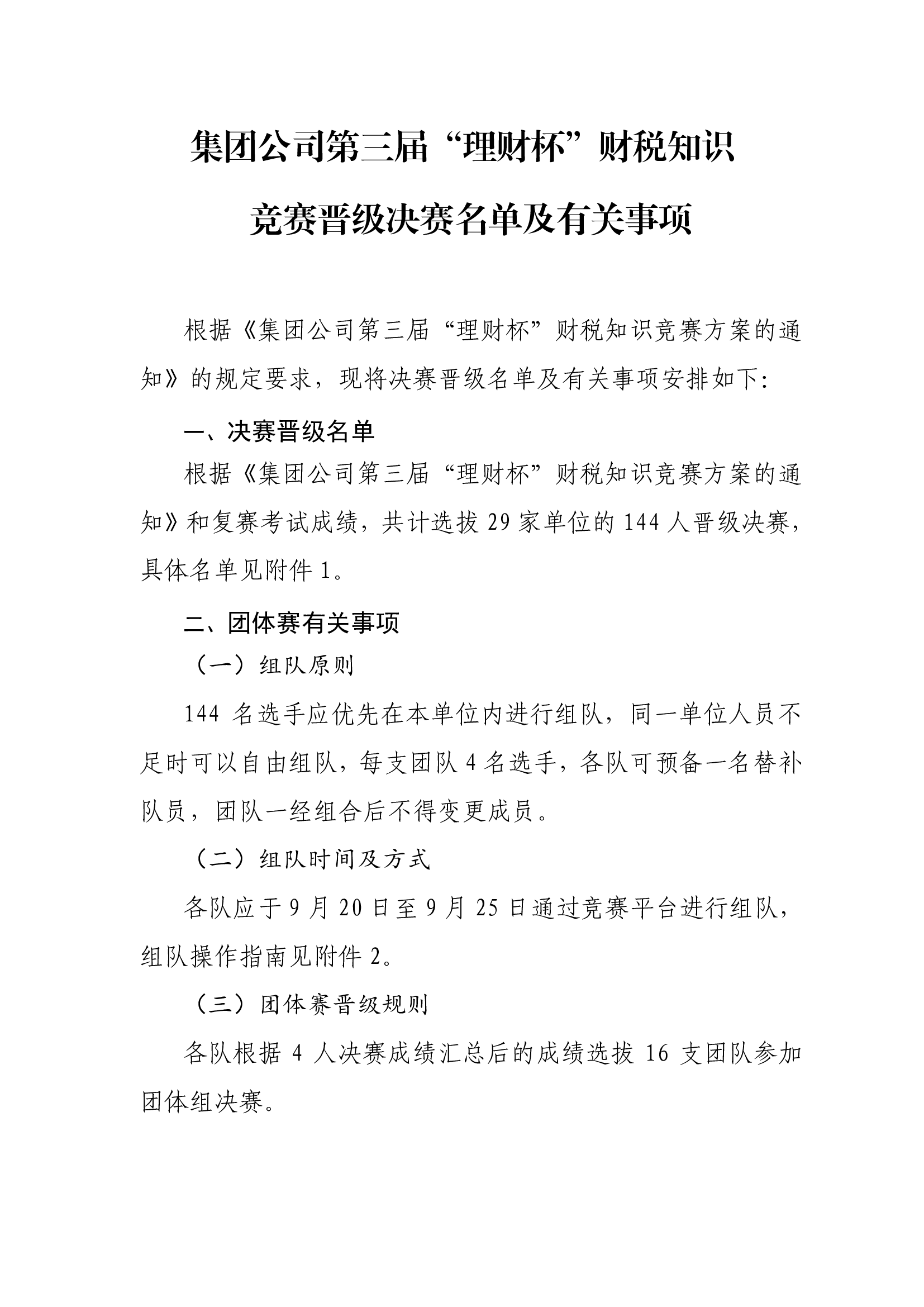 关于下发《集团公司第三届“理财杯”财税知识竞赛决赛晋级名单及有关事项》的通知