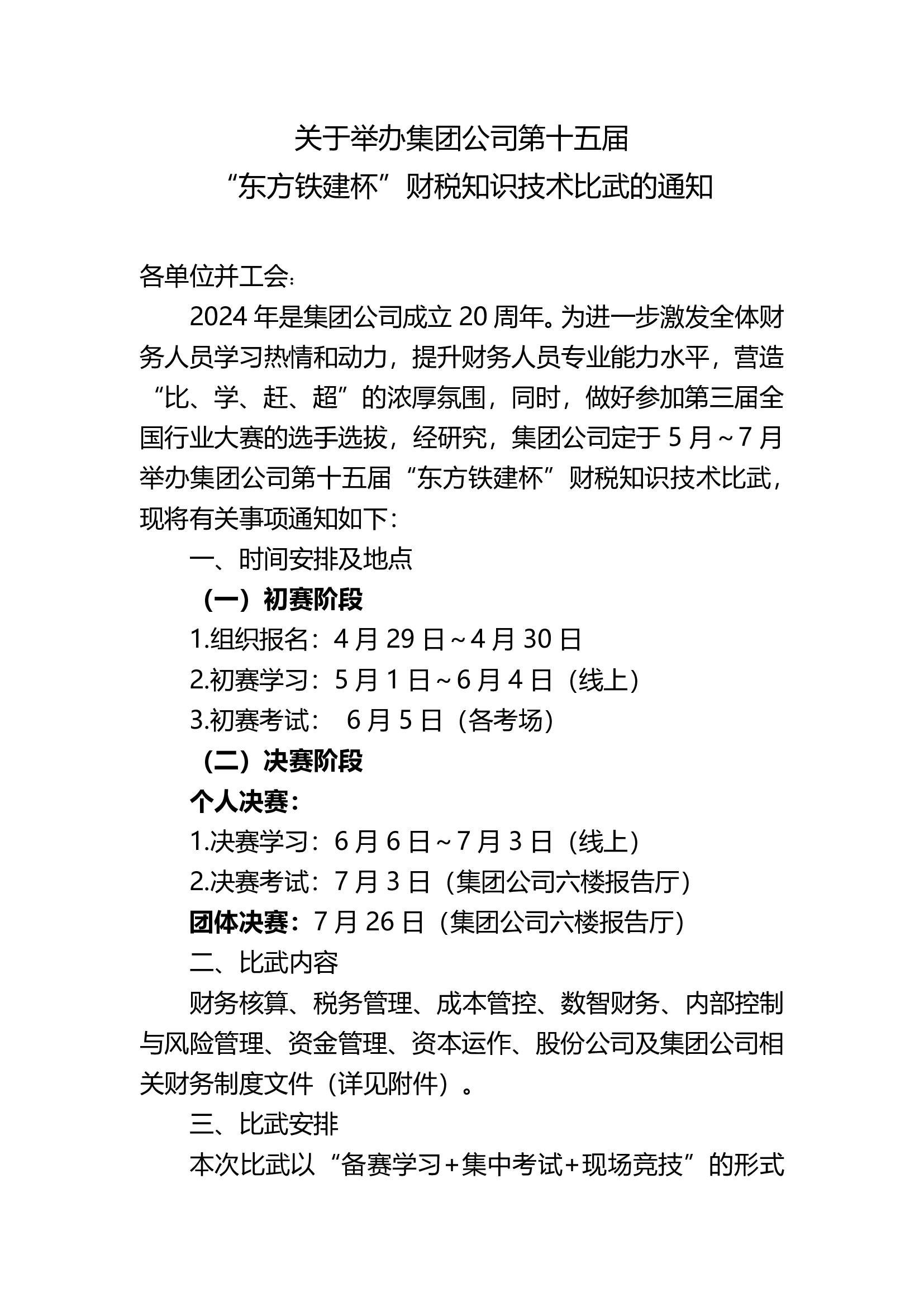 【竞赛通知】关于举办集团公司第十五届“东方铁建杯”-财税知识技能比武的通知