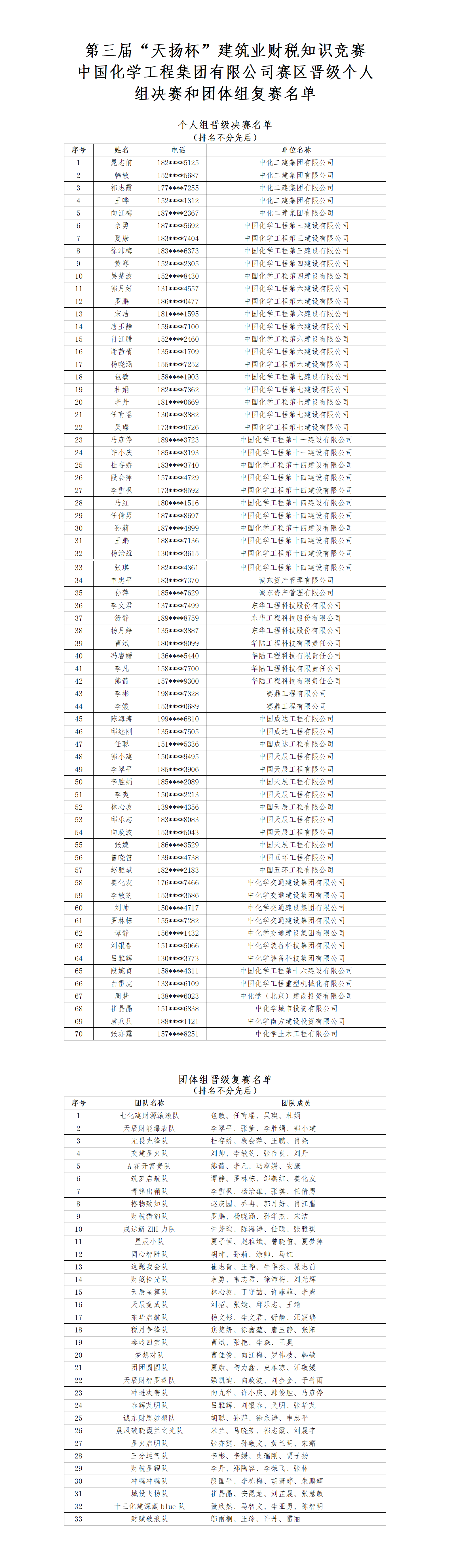 中国化学工程集团有限公司赛区晋级个人组决赛和团体组复赛名单