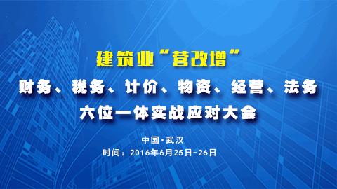 根据国家财税体制改革安排,建筑业“营改增”自5月1日起全面推行。随着实施办法与征管规定等配套政策的出台,建筑业“营改增”实施应对是企业的重中之重。为帮助企业在6月27日首个征期前准确理解新政策,把握好应对的重点难点,有效解决实际操作中的关键性问题,兹决定举办“建筑业“营改增” 财务、税务、计价、物资、经营、法务六位一体实战应对大会”。
