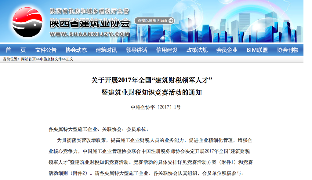 【陕西省建筑业协会】关于开展2017年全国“建筑财税领军人才” 暨建筑业财税知识竞赛活动的通知