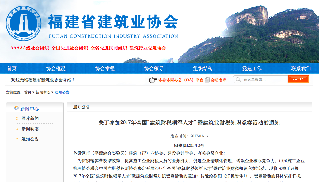 【福建省建筑业协会】关于开展2017年全国“建筑财税领军人才” 暨建筑业财税知识竞赛活动的通知