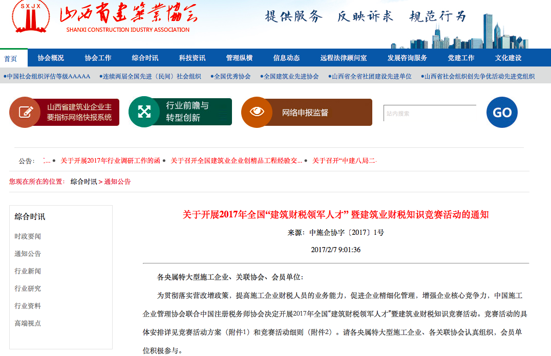 【山西省建筑业协会】关于开展2017年全国“建筑财税领军人才” 暨建筑业财税知识竞赛活动的通知