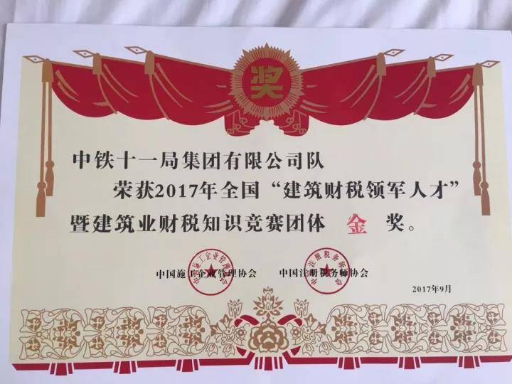 2017923-24中国施工企业管理协会和中国注册税务师协会联合举办的“天扬杯”2017年全国建筑业财税知识竞赛在北京首都经贸大学举行,中铁十一局夺得团体赛金奖,在全国10个金奖团队中排名第四,同时在个人赛中夺得1枚金奖、2银奖、6铜奖