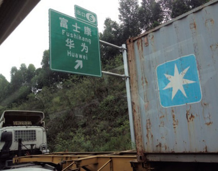 通往华为园区的高速公路出口。毗邻富士康的工厂