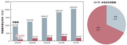 2039.92亿元人民币的销售额,185.82亿元的营业利润——这是华为2011年的结算业绩。虽然2010年至2011年的增长放缓,但2007年至2011年实现了年均约22%的猛烈增长势头,在国外的销售额比例也达到了68%(图1)。