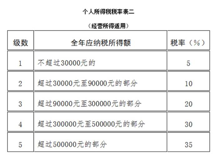 “(二)经营所得,适用百分之五至百分之三十五的超额累进税率(税率表附后);