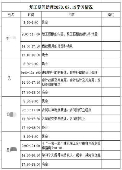 第二事业部的同事们在复工期间的学习情况得到了事业部总经理杨总、分管总监及各部门成员的高度重视。采用分组学习的方式,每个小组均有负责人,每天对大家的学习进度以及学习情况进行跟进。对每位学员的疑难点,在群内随时提问,进行针对性的答疑。在学习反馈方面,第二事业部采用日志上报的方式,进行自我反思,回顾一天所学,同时设置日志共享人,各位领导可以随时查看,发现并帮助参赛者解决在学习中的问题。