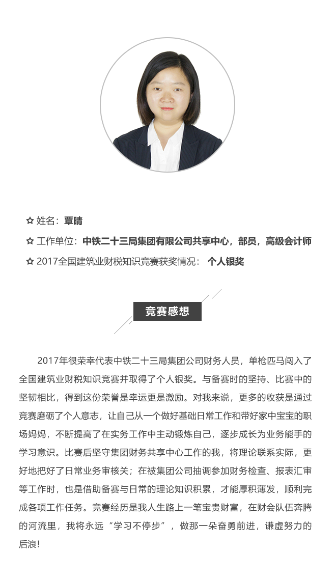 2017年很荣幸代表中铁二十三局集团公司财务人员,单枪匹马闯入了全国建筑业财税知识竞赛并取得了个人银奖。