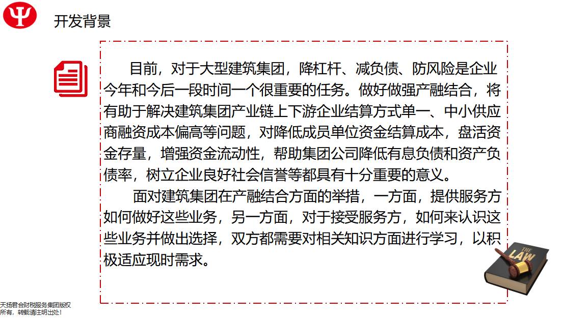 • 做好做强产融结合,将有助于解决建筑集团产业链上下游企业结算方式单一、中小供应商融资成本偏高等问题,对降低成员单位资金结算成本,盘活资金存量,增强资金流动性,帮助集团公司降低有息负债和资产负债率,树立企业良好社会信誉等都具有十分重要的意义。