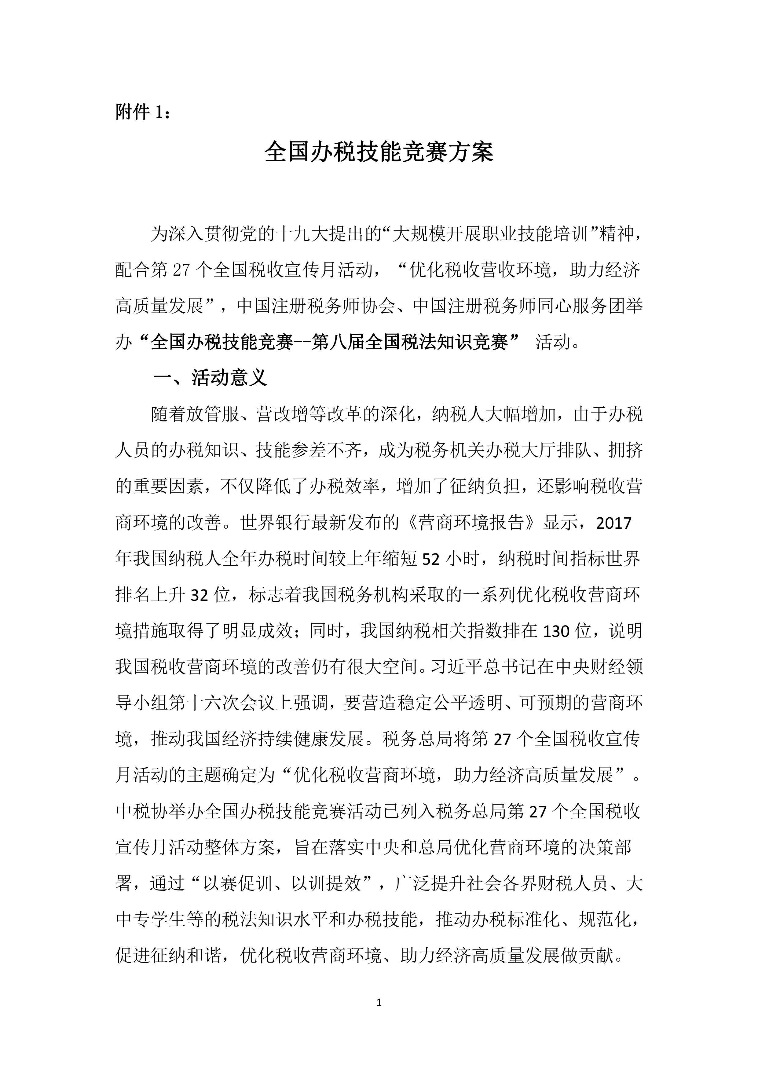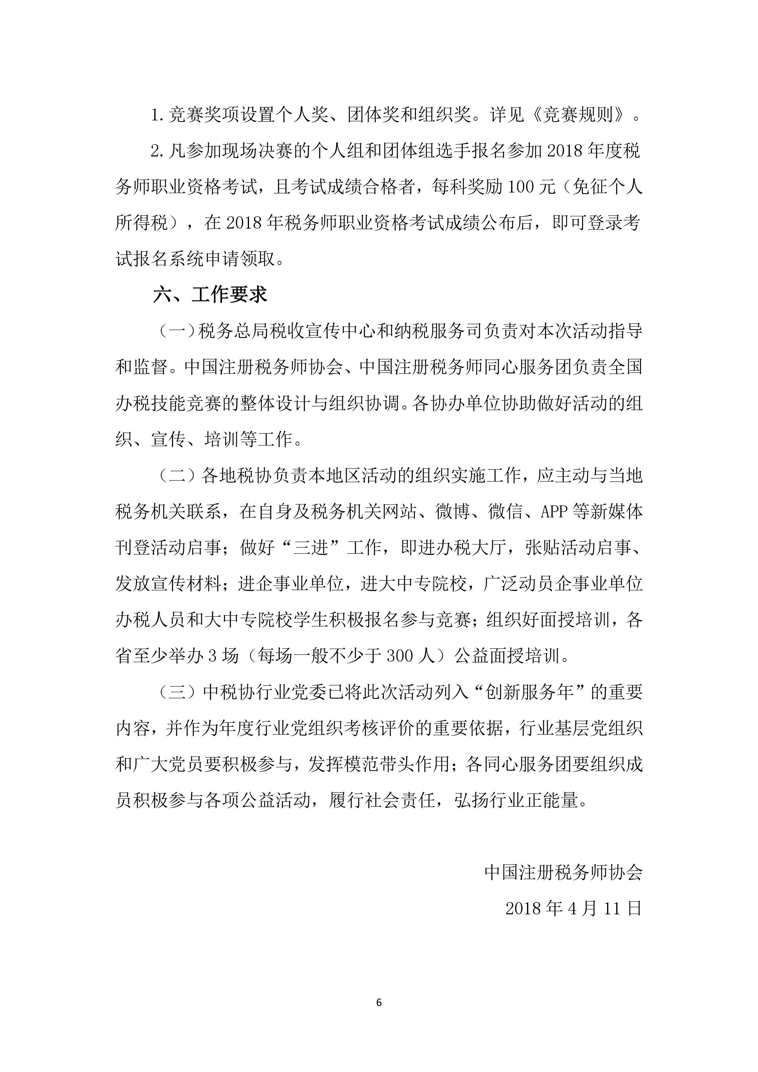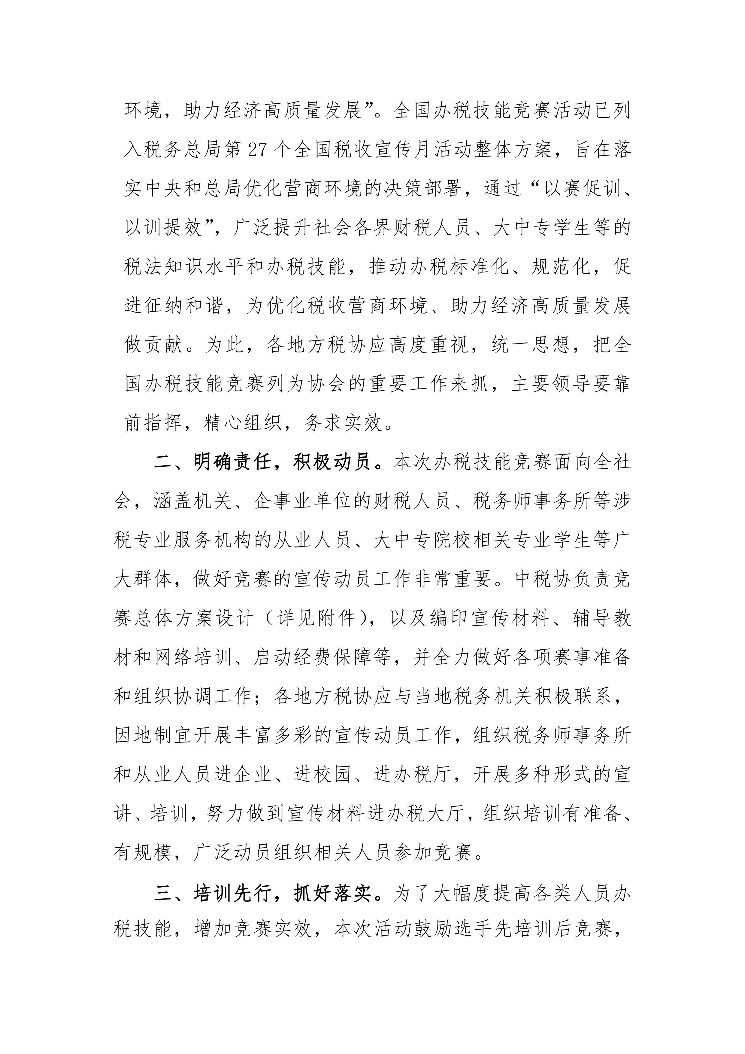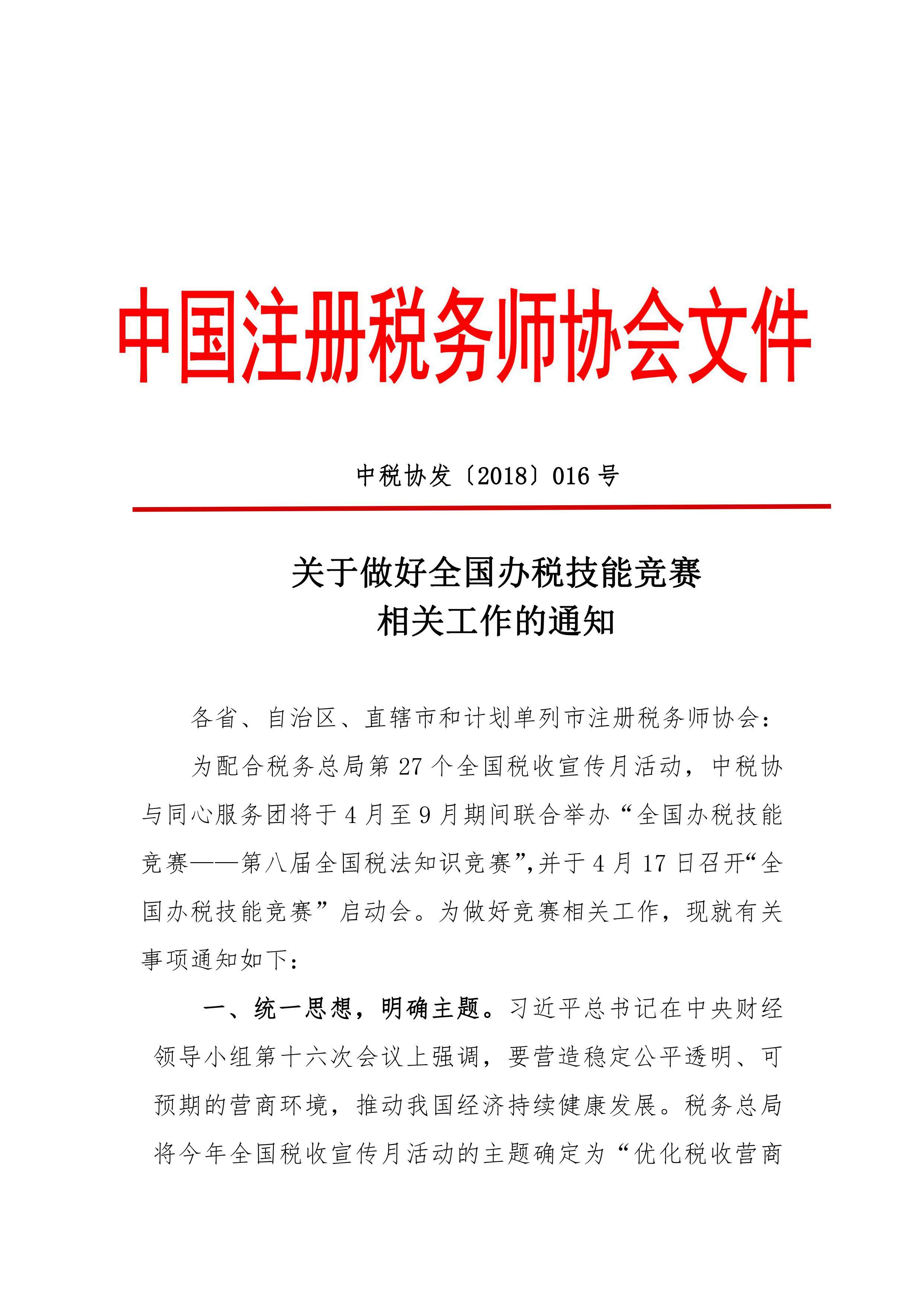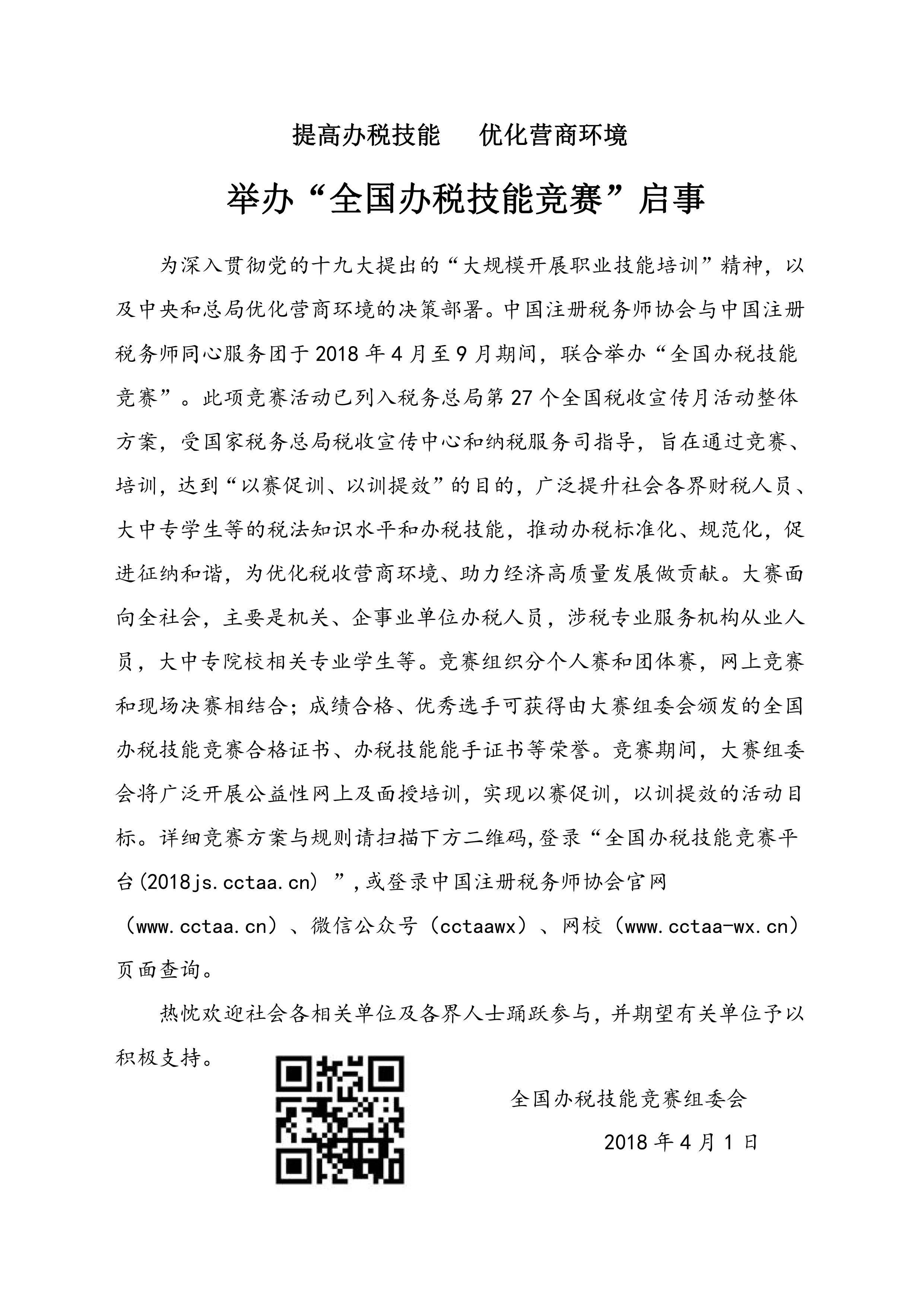 为深入贯彻党的十九大提出的“大规模开展职业技能培训”精神,以及中央和总局优化营商环境的决策部署,配合税务总局开展第27个税收宣传月活动。中国注册税务师协会与中国注册税务师同心服务团于2018年4月至9月期间,举办“全国办税技能竞赛”,竞赛辅以培训,以赛促训、以训提效,提升社会各界财税人员、大中专学生等的税法知识水平和办税技能,推动办税标准化、规范化。