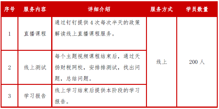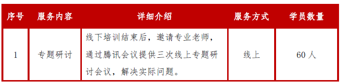 课后研讨阶段是在线下培训结束后,根据企业相关主题,邀请相关专业老师,通过腾讯会议以研讨会的形式为学员提供专业的指导,解决企业在日常工作中遇到的难点问题。具体服务内容如下: