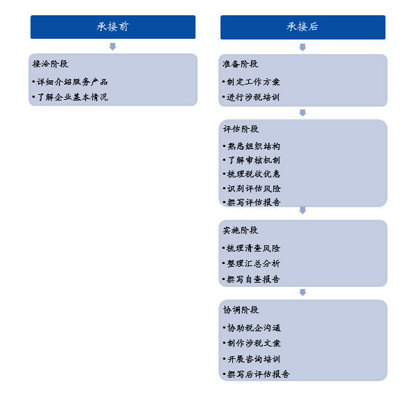 我公司项目小组通过座谈等方式了解企业基本信息,明确工作内容、时间要求、参与部门、沟通机制,制定和细化工作方案。经过前期准备阶段后,进入实施阶段,重点通过从企业财务、人力、合同和实施等部门获取的资料与信息,对B公司的主要业务流程、财务制度和数据、纳税情况等等事项中存在的风险与问题进行详细的梳理与分析。