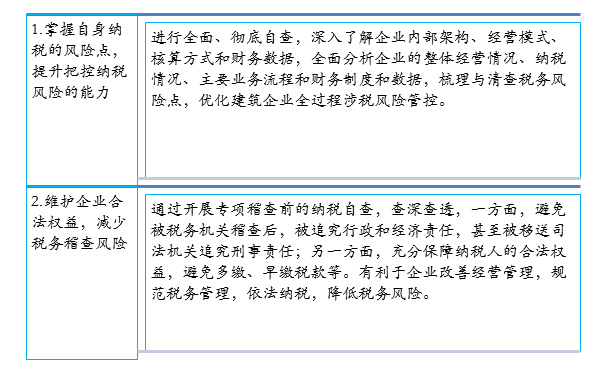 本次纳税自查咨询服务以现场辅导+抽查样本的方式进行。自查中,一是坚持边自查、边整改原则,通过完善合同条款、补充原始资料、充分享受优惠等方法,对自查中发现的涉税问题,实时提出应对方案,规避涉税风险;二是注重实效原则,通过自查,清晰业务执行过程中的涉税风险点,要求各业务部门自行建立与完善相关制度,进而降低涉税风险。