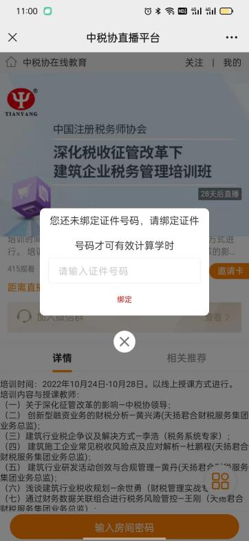 4、绑定身份证成功后,输入房间密码:20221024,观看直播。